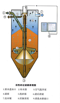 开云·体育世界杯(中国)官方网站 采用逆流原理,污水由设备上部进入分配管并由安装在设备底部的分水器分水,向上流经滤床而被过滤,然后由开云·体育世界杯(中国)官方网站 上部的滤液出水口流出。被滤砂截留的杂质和滤砂一起从设备锥形底部经滤料提升装置提升至设备顶部的洗砂器内。砂的清洗从被滤料提升装置提升时就开始,在紊流作用下使杂质从砂粒中分离出来。杂质随洗砂水经污水排放口排放,清洗后的砂颗粒(密度高)自由沉降到砂床上。实现水的净化与砂的清洗同时进行的连续过滤过程。